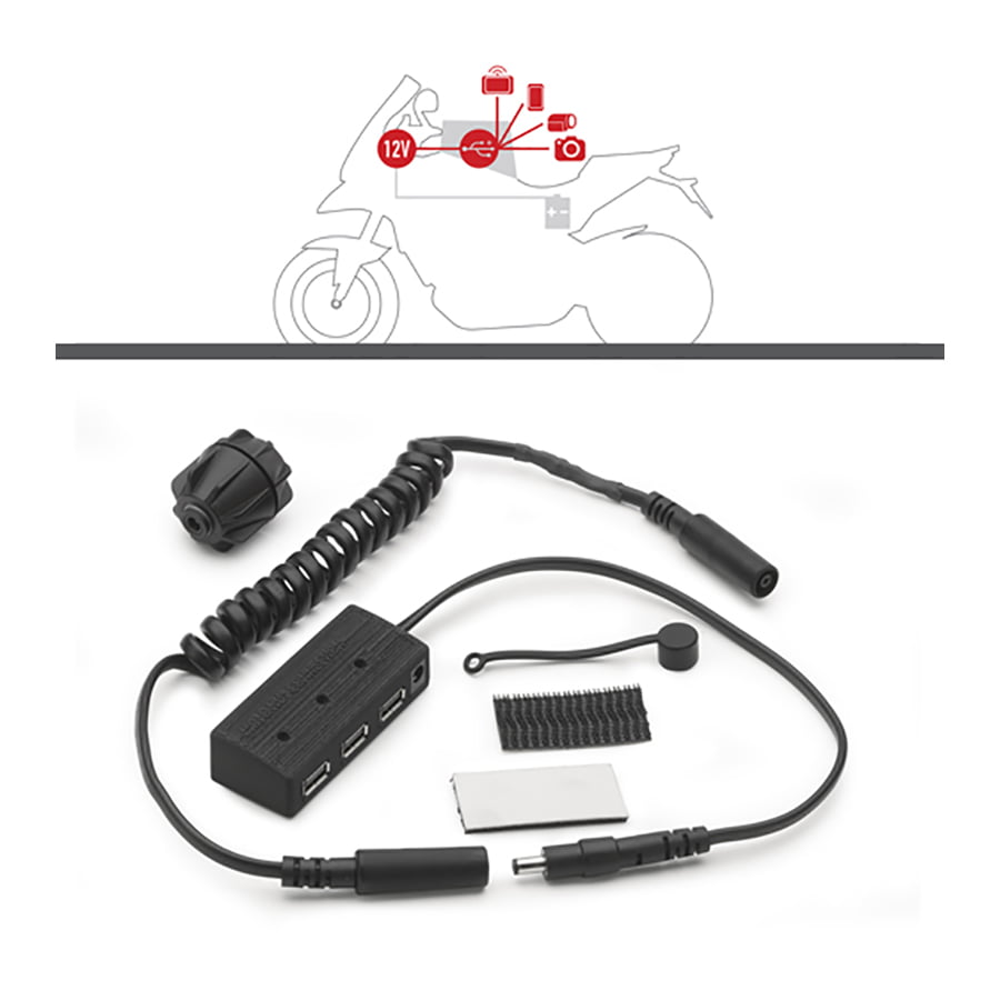 Kit Power Hub para la alimentación interna de las bolsas de depósito.- Permite alimentar tres dispositivos por medio de puerto USB y un cuarto con conector ISO 12v. – Kit cableado externo a la bolsa completamente impermeable. – Permite cargar tres dispositivos con puertos USB por un toal de 9000 mA (3x3000mA). – Posibilidad de utilización cable USB original de los dispositivos sin la necesidad de comprar un reductor.A combinar necesariamente con el kit S110.