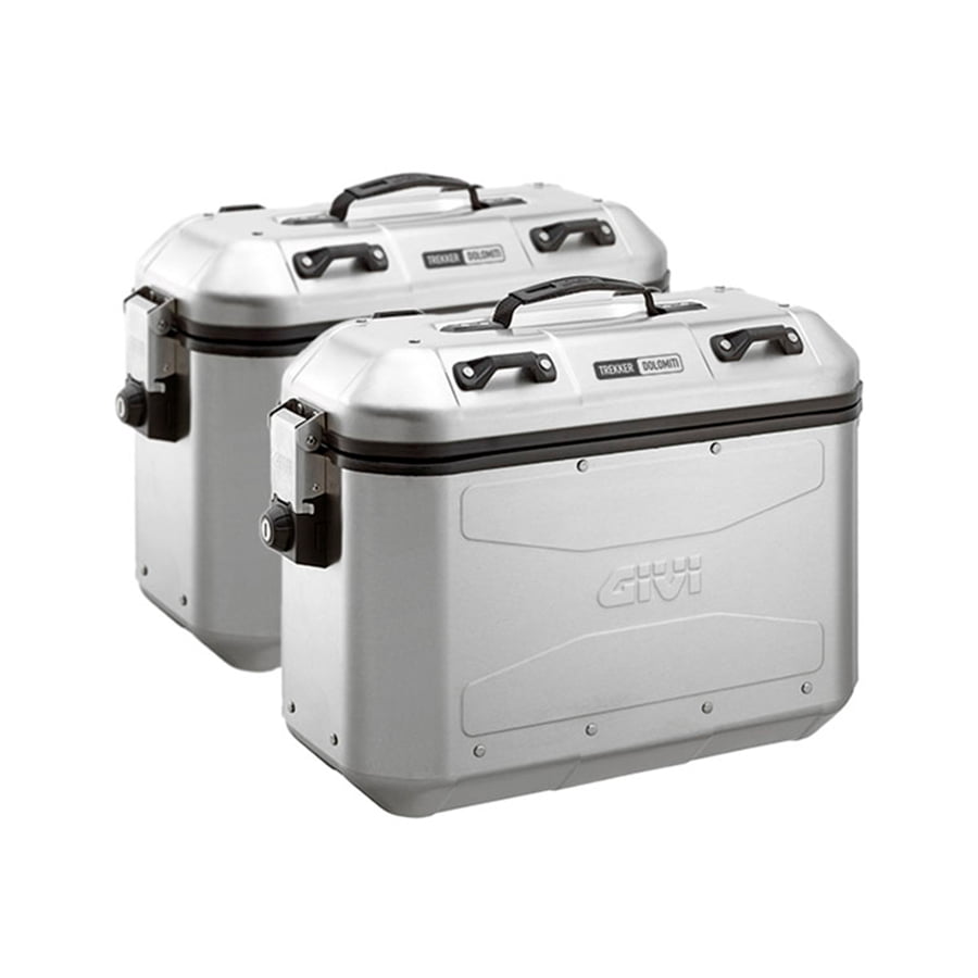 Maletas laterales Givi DLM36 Trekker Dolomiti.Las novedosas maletas Givi Trekker Dolomiti DLM36 ofrecen capacidad de 36 litros y se caracterizan por su elegante y robusto diseño enfocado a las motos maxi trail. Su diseño se basa sobre todo en la funcionalidad con una tapa superior desmontable en segundos y dispuesta de asa para un cómodo transporte de la maleta bajo de la moto. La misma tapa también cuenta con cuatro abrazaderas de nylon que permiten la fijación de una bolsa auxiliar mediante correas Trekker Straps de Givi u otros pulpos de amarre. Realizadas con aluminio natural de 1,5 mm, combina fibra de vidrio y materiales plásticos de alta calidad para ofrecer un peso muy ligero y resistencia. Además posee una tapa con el fondo remachado en acero inox que le proporcionan excelente rigidez.El cierre Security Lock con tapón guardapolvo de serie permiten una apertura fácil. Las maletas laterales Givi Trekker Dolomiti DLM36 se cierran con la misma llave y disponen además de un tercer bombín de recambio con la misma llave de las dos maletas. Las gomas de alta calidad en el marco garantizan un cierre perfectamente sellado mientras que en el interior cuenta con una espuma acolchada para mayor protección.